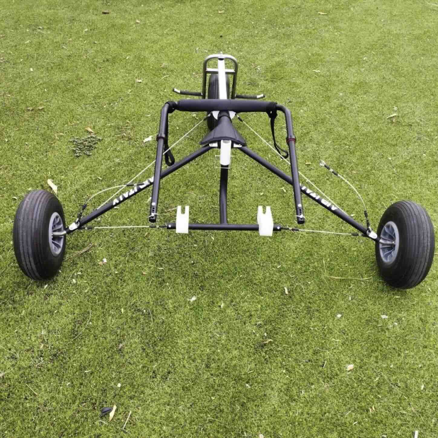 De Black Angel paramotor trike is de gemakkelijkst te monteren en demonteren trike op de markt. Met slechts één beweging en drie pennen is hij klaar voor gebruik, zonder dat je moeite hoeft te doen. De aandrijving wordt erop geplaatst met een snelkoppeling systeem. Hij weegt 11 kg of maar 9 kg met de smalle wielen.